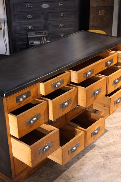 Meuble de metier ancien en bois massif a 9 tiroirs et dessus en metal brut patiné